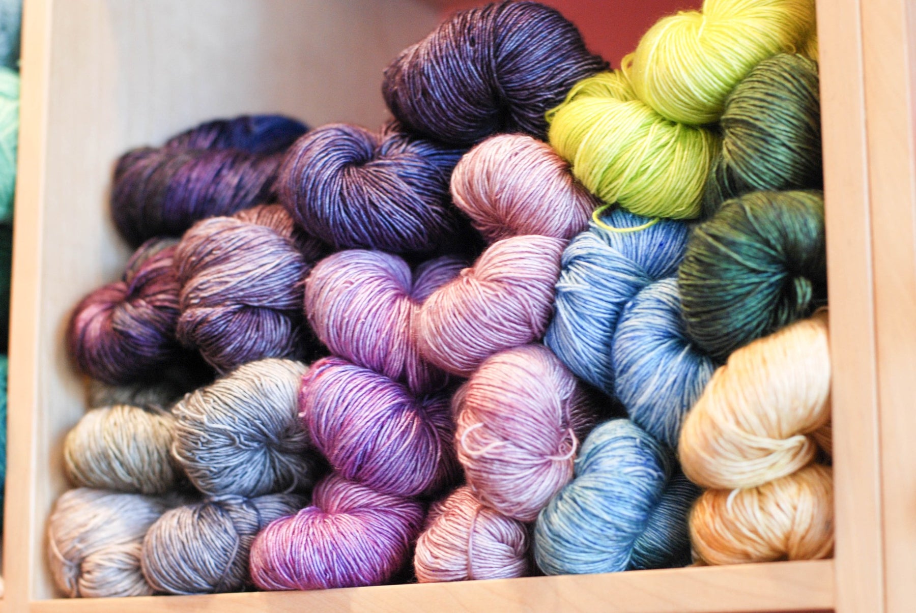 This is why I am super excited to announce that Yarn is now the home of Tributary Yarns. Tributary Yarns is a new indie dyed yarn from right here in Humboldt County. The dyer - Andrea is someone I've known for many years. I've enjoyed following her blog This Knitted Life and was excited for her when she recently started hand dyeing yarn. When Andrea contacted me a few weeks ago to see if I'd be interested in carrying her yarn in my shop, it was an enthusiastic, "Yes!" I'm loving the colors that Andrea is coming up with and the yarn bases she's using are wonderful.