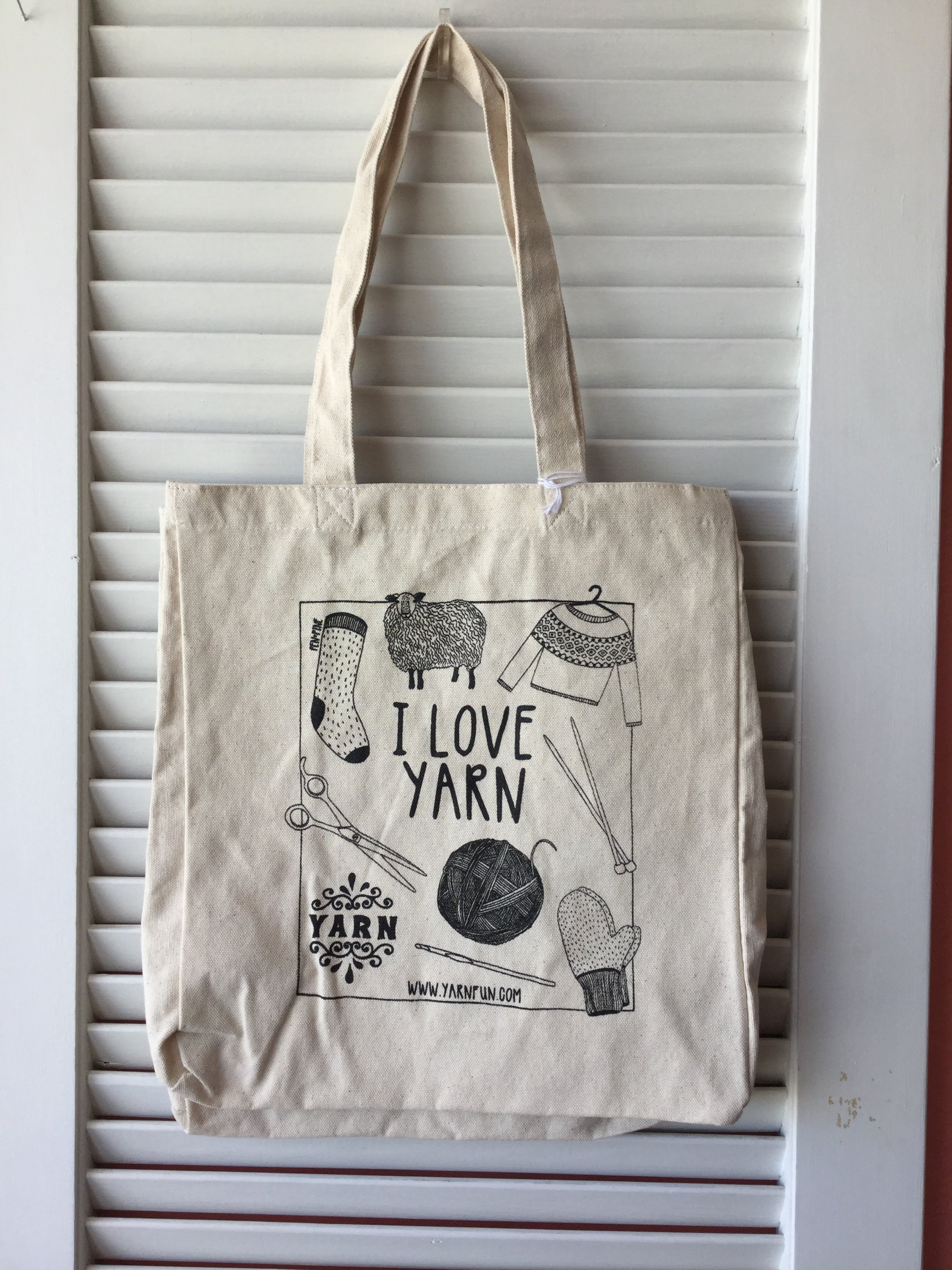 The I Love Yarn tote bags were designed by our local artist Jenna of Pen & Pine. It is the same design as our I Love Yarn mugs but reoriented for the tote bag. It’s a 100 percent cotton canvas, screen printed locally. The bag measures 12.5 wide by 13.5l tall by 8.5” deep. It’s a great size for carrying a large project or to use as a shopping bag.