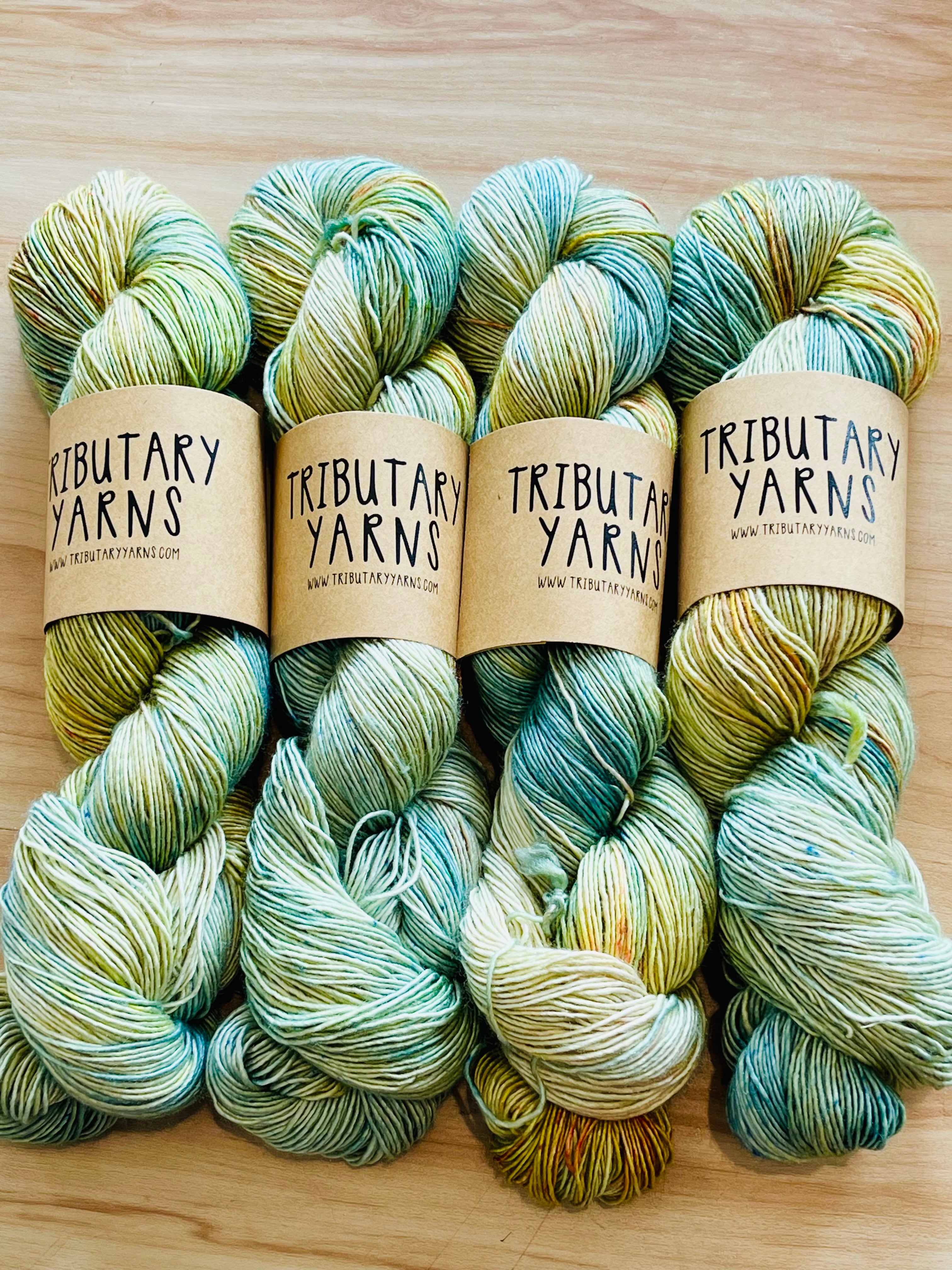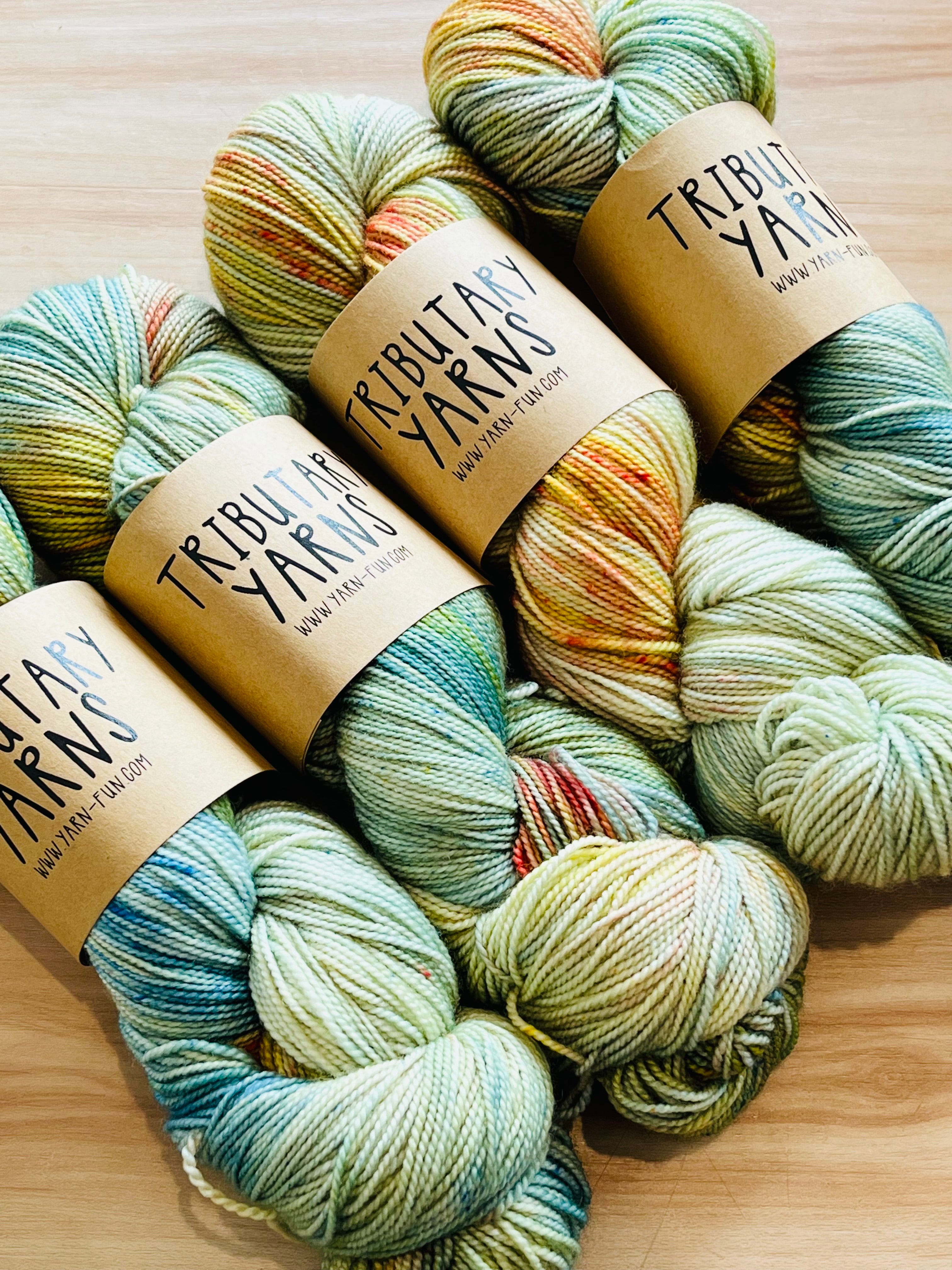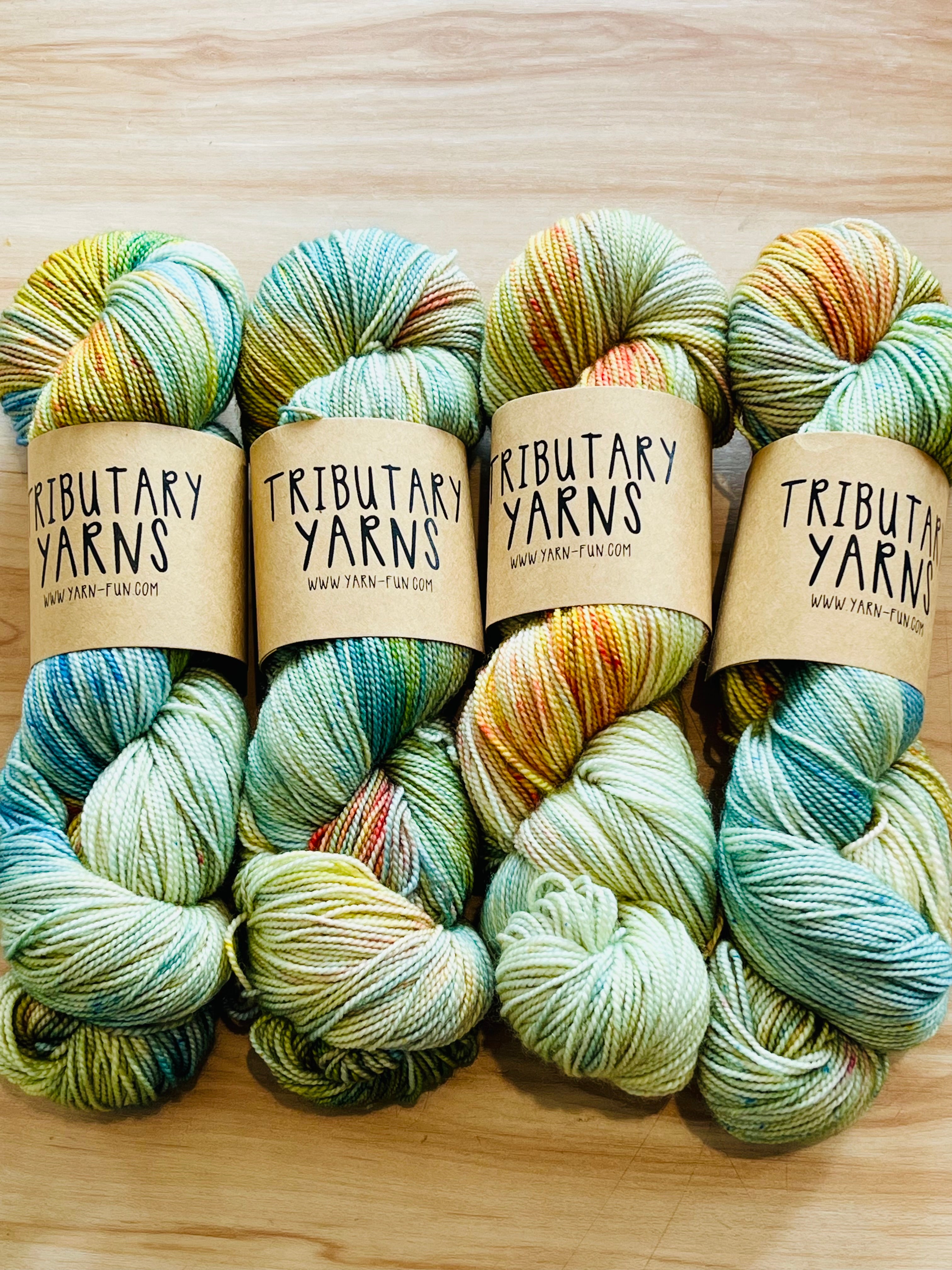 The limited edition Tributary Yarns color of the month for November is here! We dye this beautiful yarn in house in the Stream Sock 2.0 base. The color this month is called Ma-l'el Dunes. This colorway is a variegated blend of a warm cream, terracotta and moss green. This month we have a few skeins of our River Silk blend as well as the Stream Sock base.
