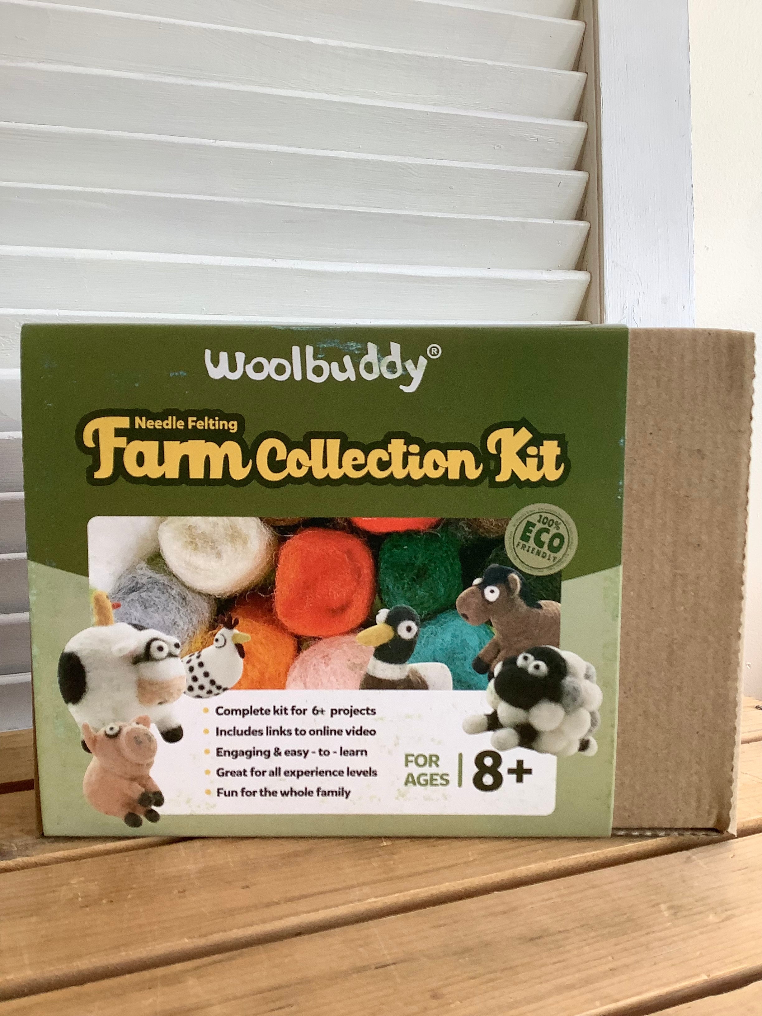 The farm kit includes - core wool and colored wool, instruction booklet, online tutorial videos for creating 6+ farm animals, a wool felting mat and 4 felting needles.