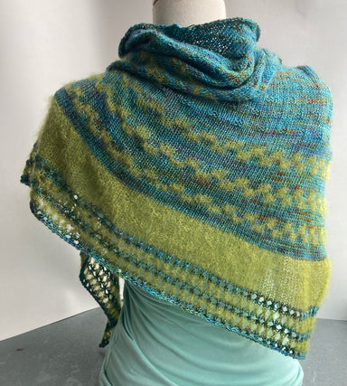 This shawl experiments with doing color work using two completely different yarns. The hand dyed, silk blend fingering weight yarn adds a nice dra...