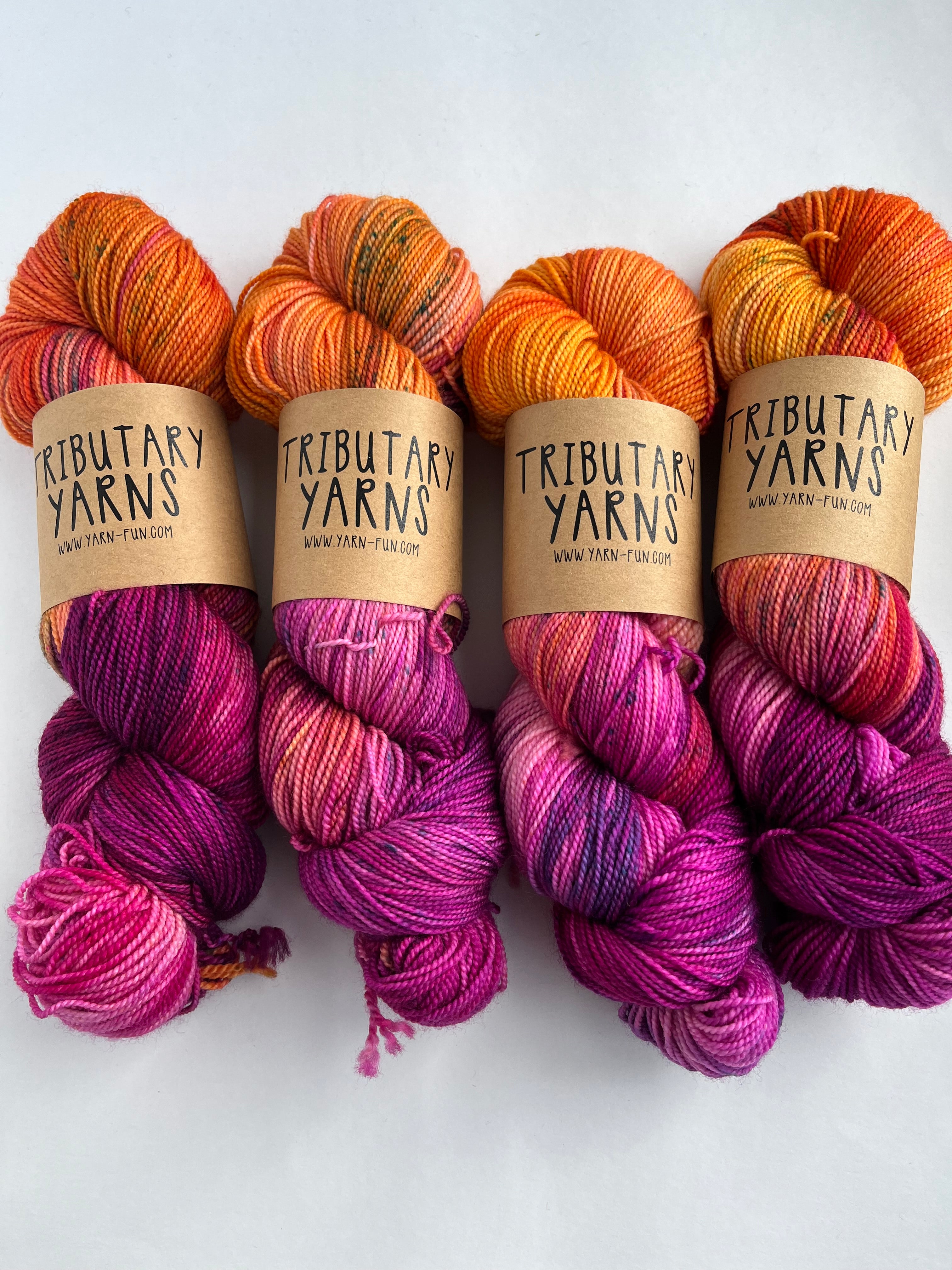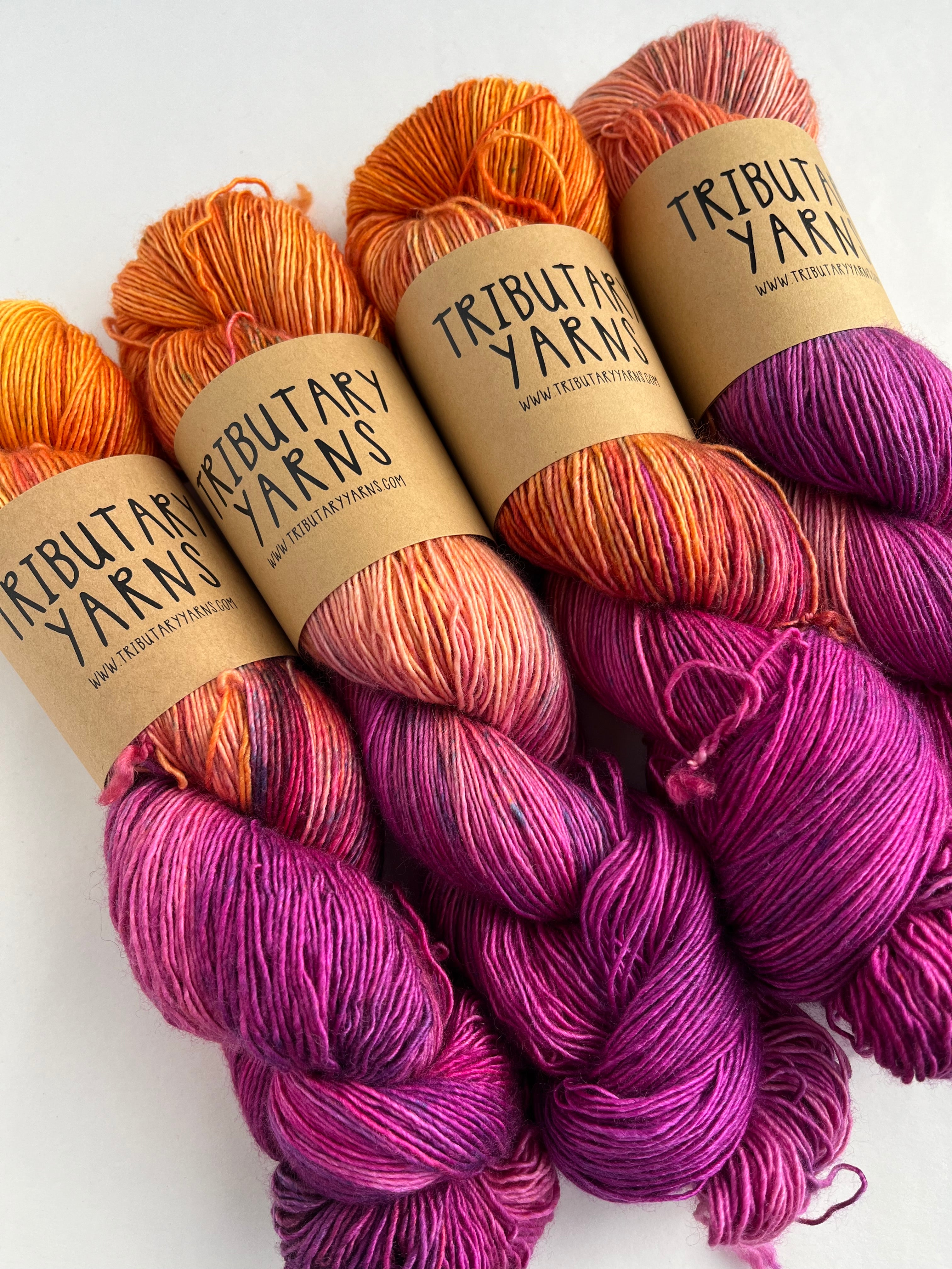 The limited edition Tributary Yarns color of the month for November is here! We dye this beautiful yarn in house in the Stream Sock 2.0 base. The color this month is called Ma-l'el Dunes. This colorway is a variegated blend of a warm cream, terracotta and moss green. This month we have a few skeins of our River Silk blend as well as the Stream Sock base.