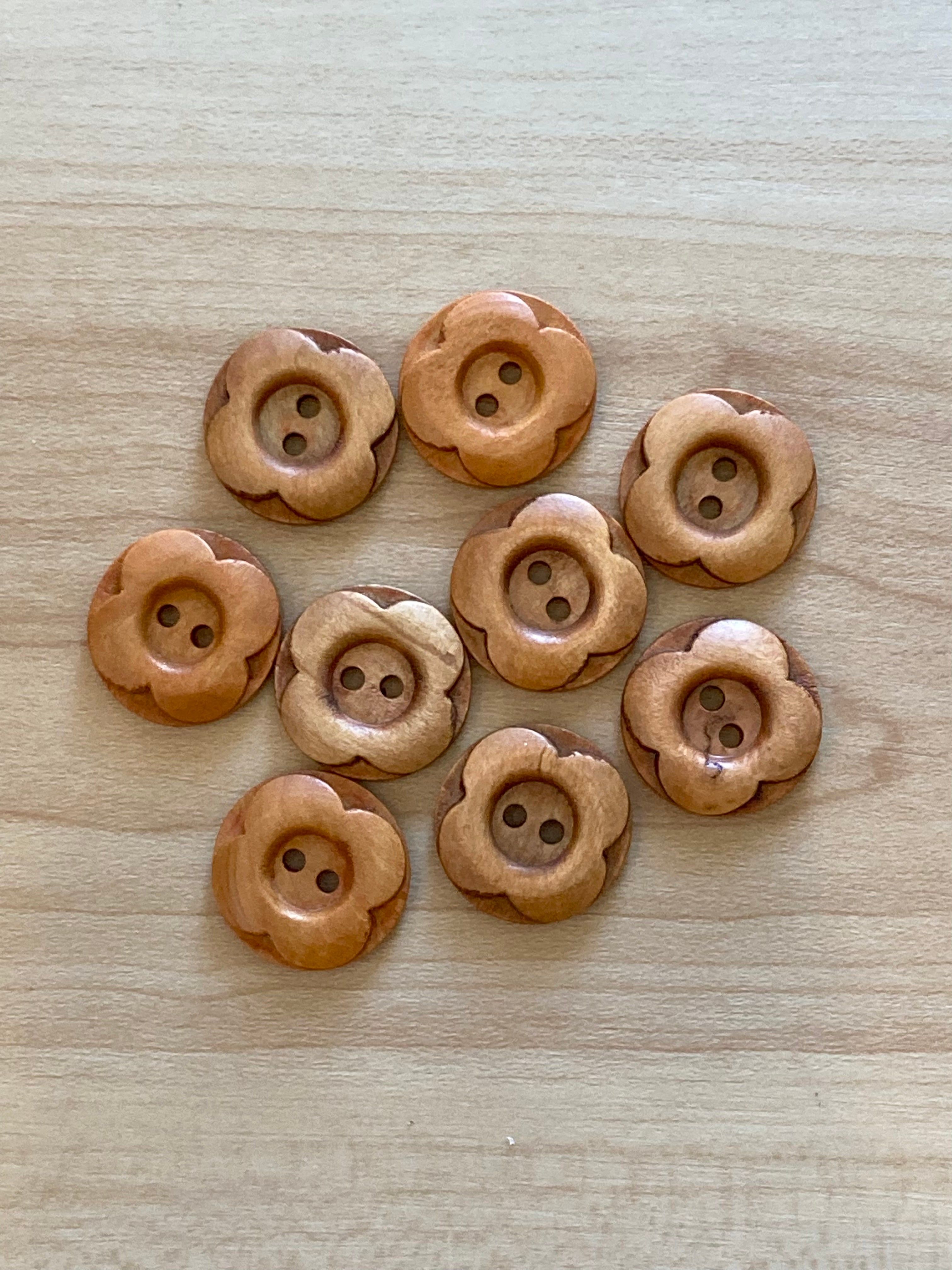 These sweet wooden buttons are round with a carved flower on top. These buttons are a great size for a cardigan sweater. They are 3/4" across.