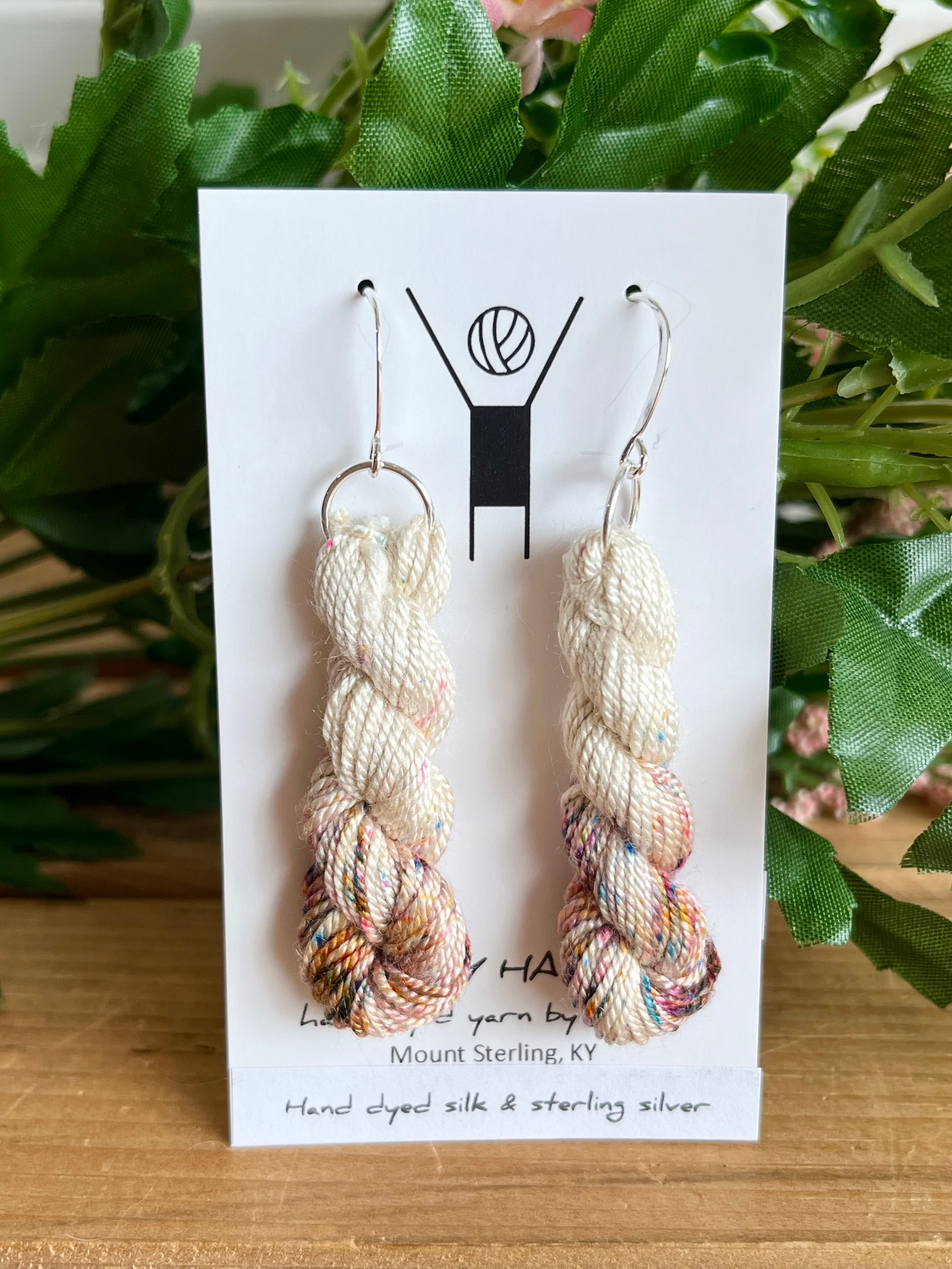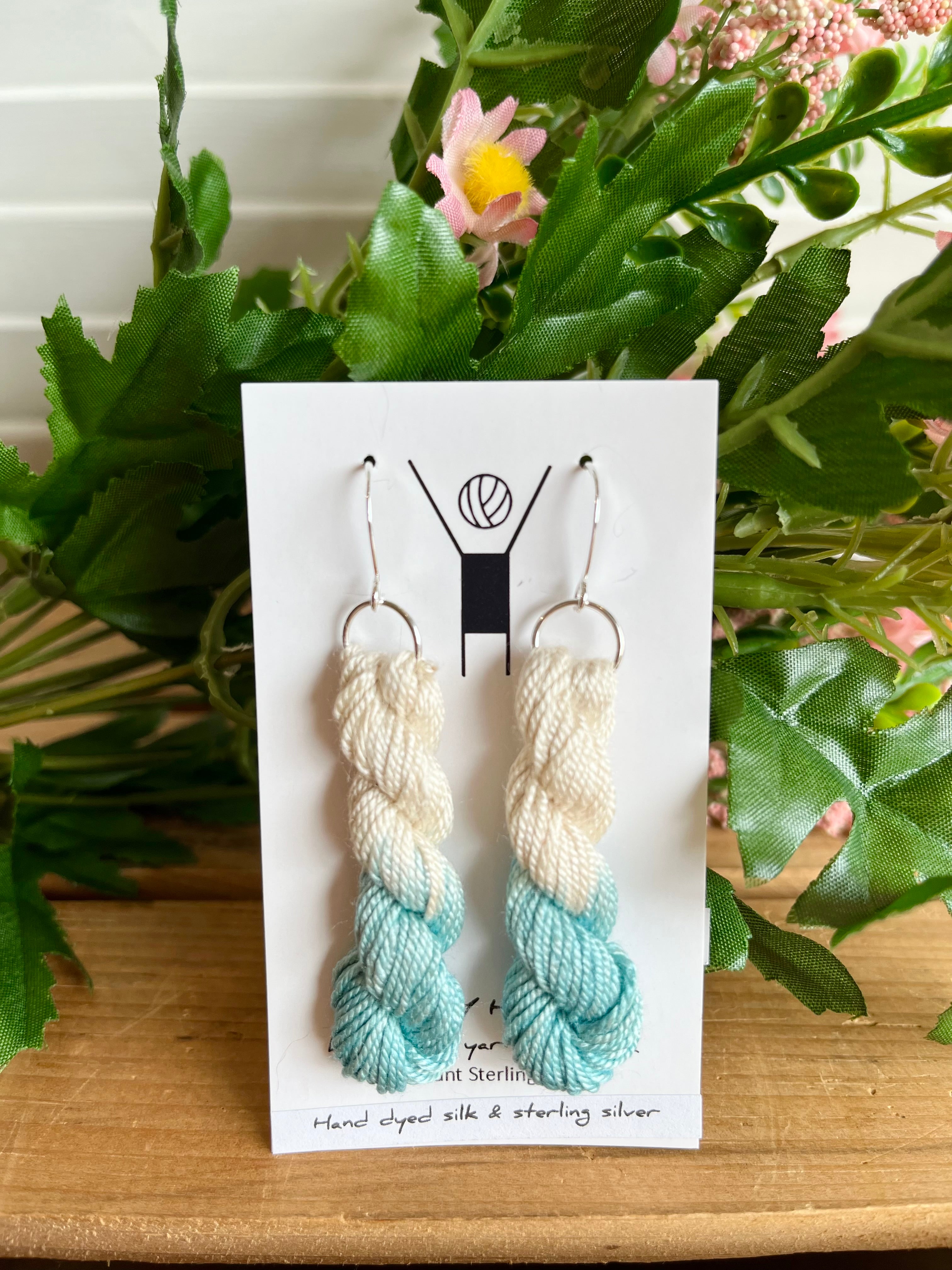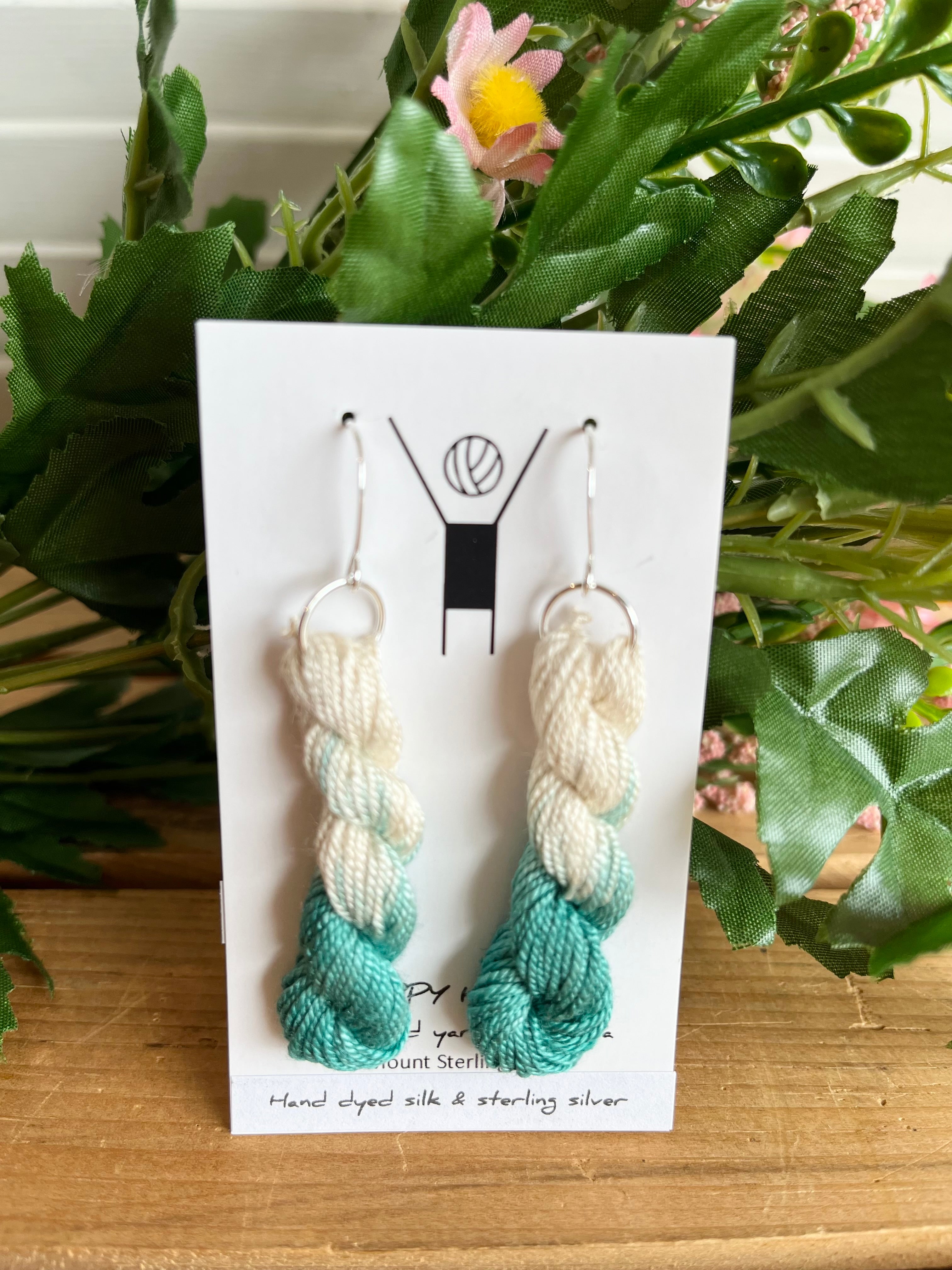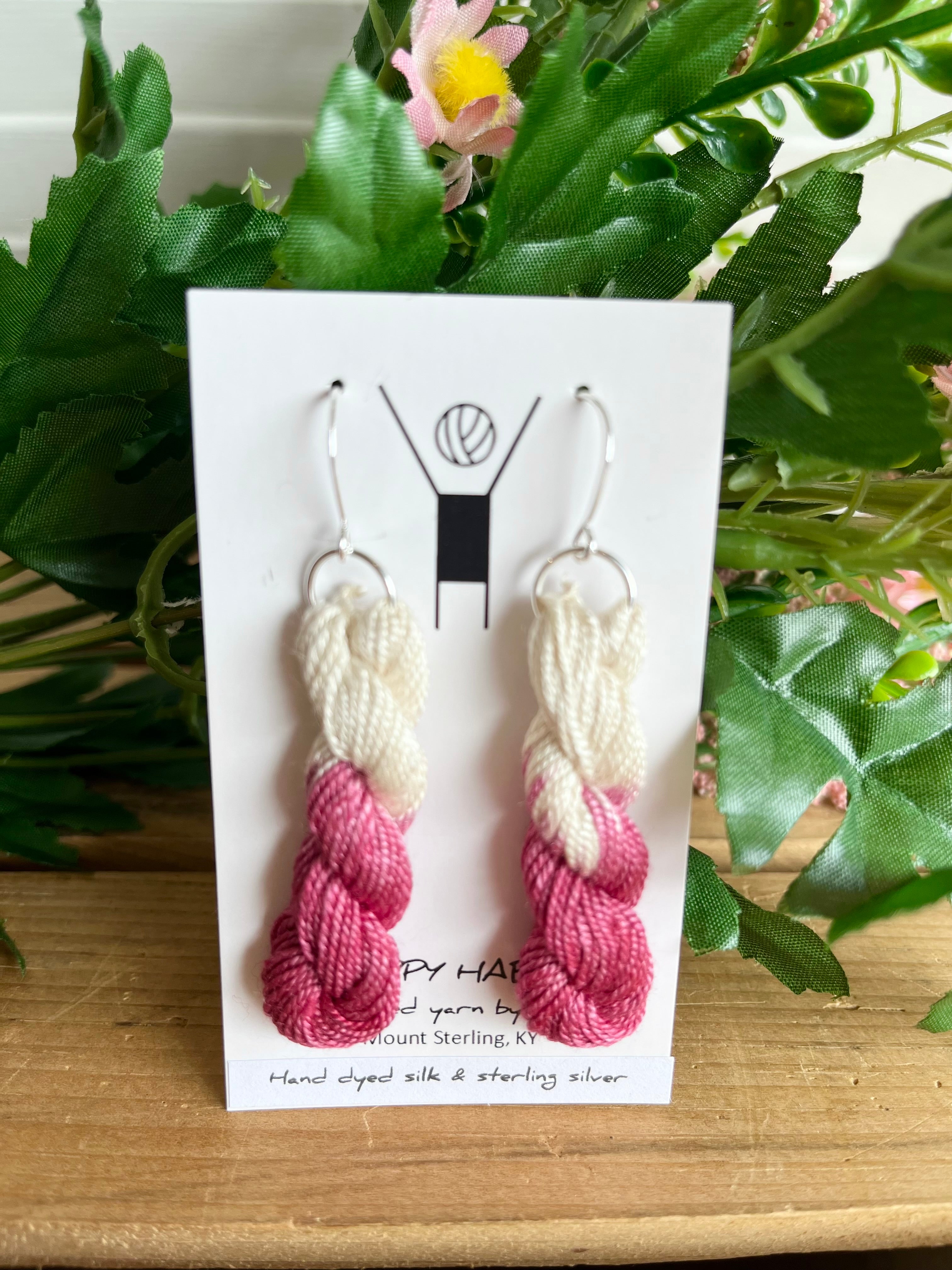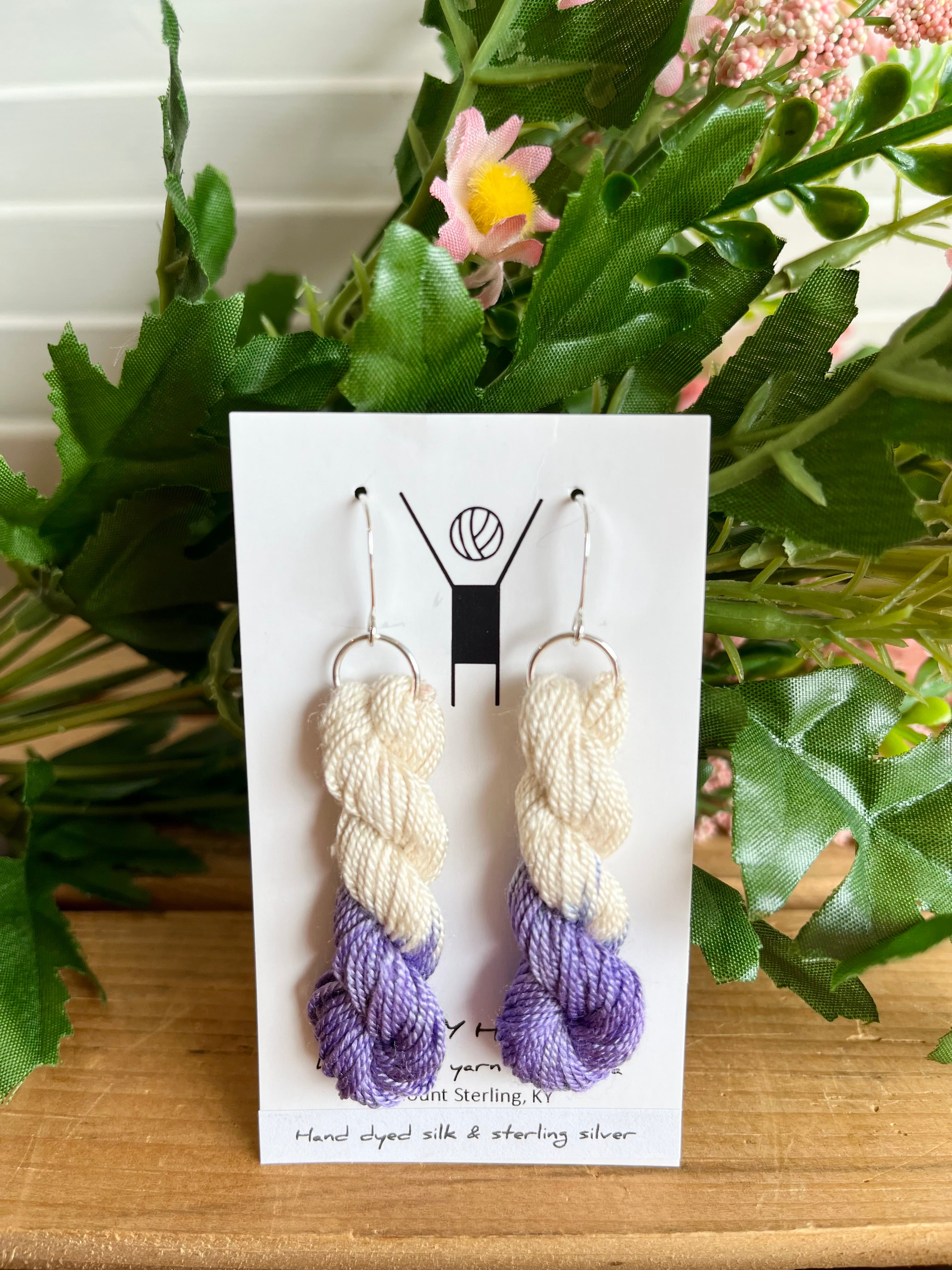 These lovely earrings are made by our friend and fellow local yarn store owner, Laura Groff. They are hand dyed silk yarn and sterling silver rings and earring hooks. They make a wonderful gift for your favorite knitter!