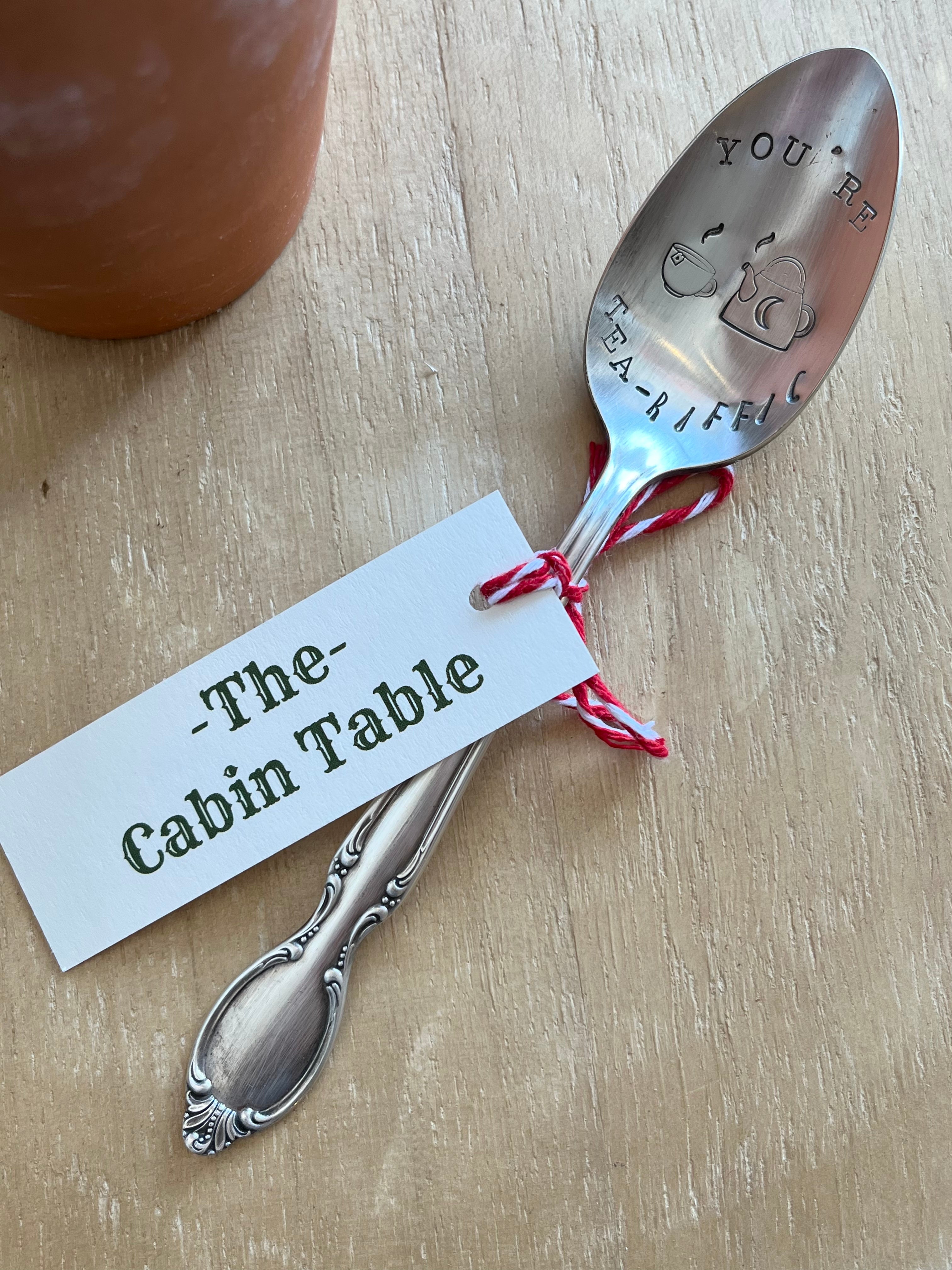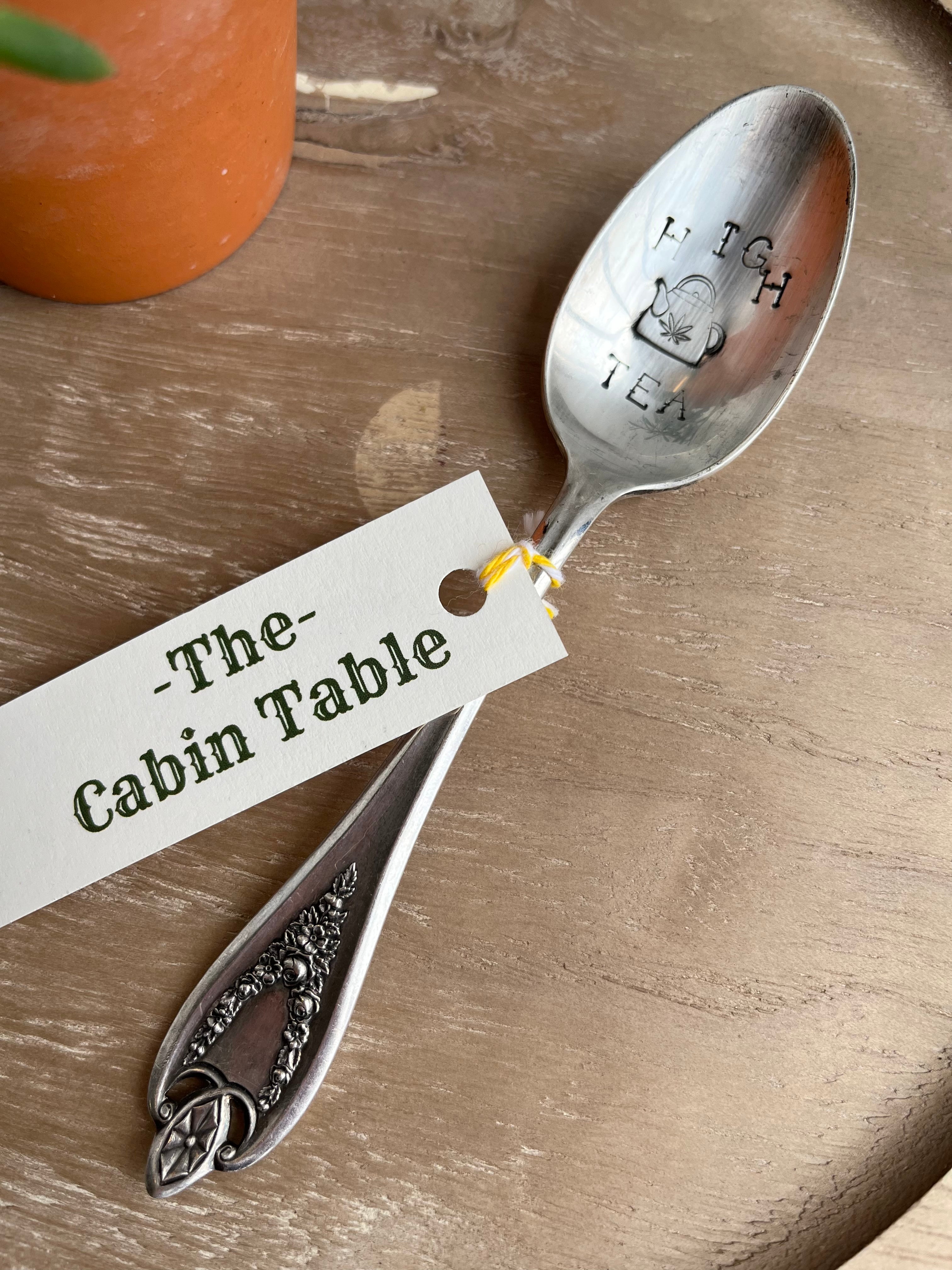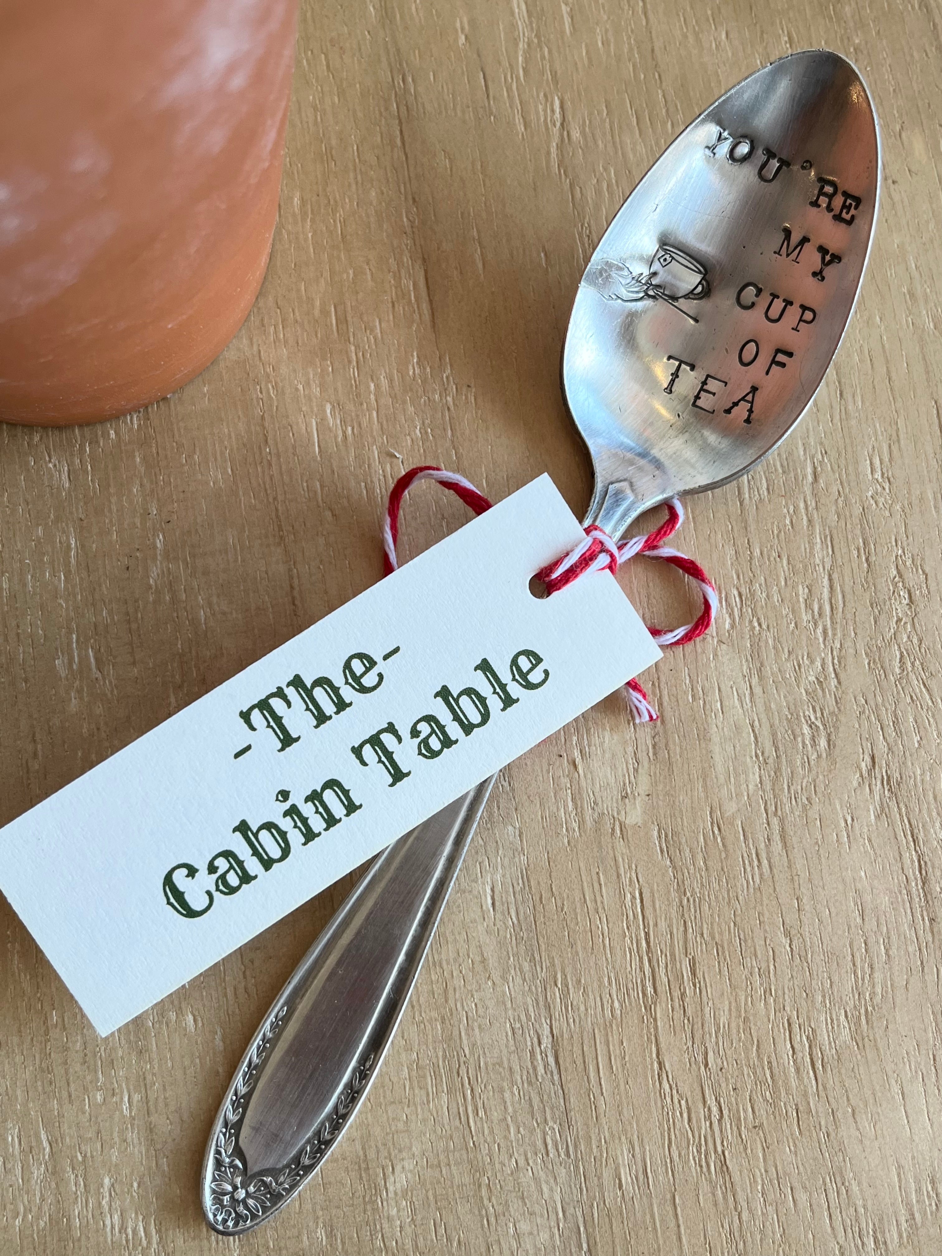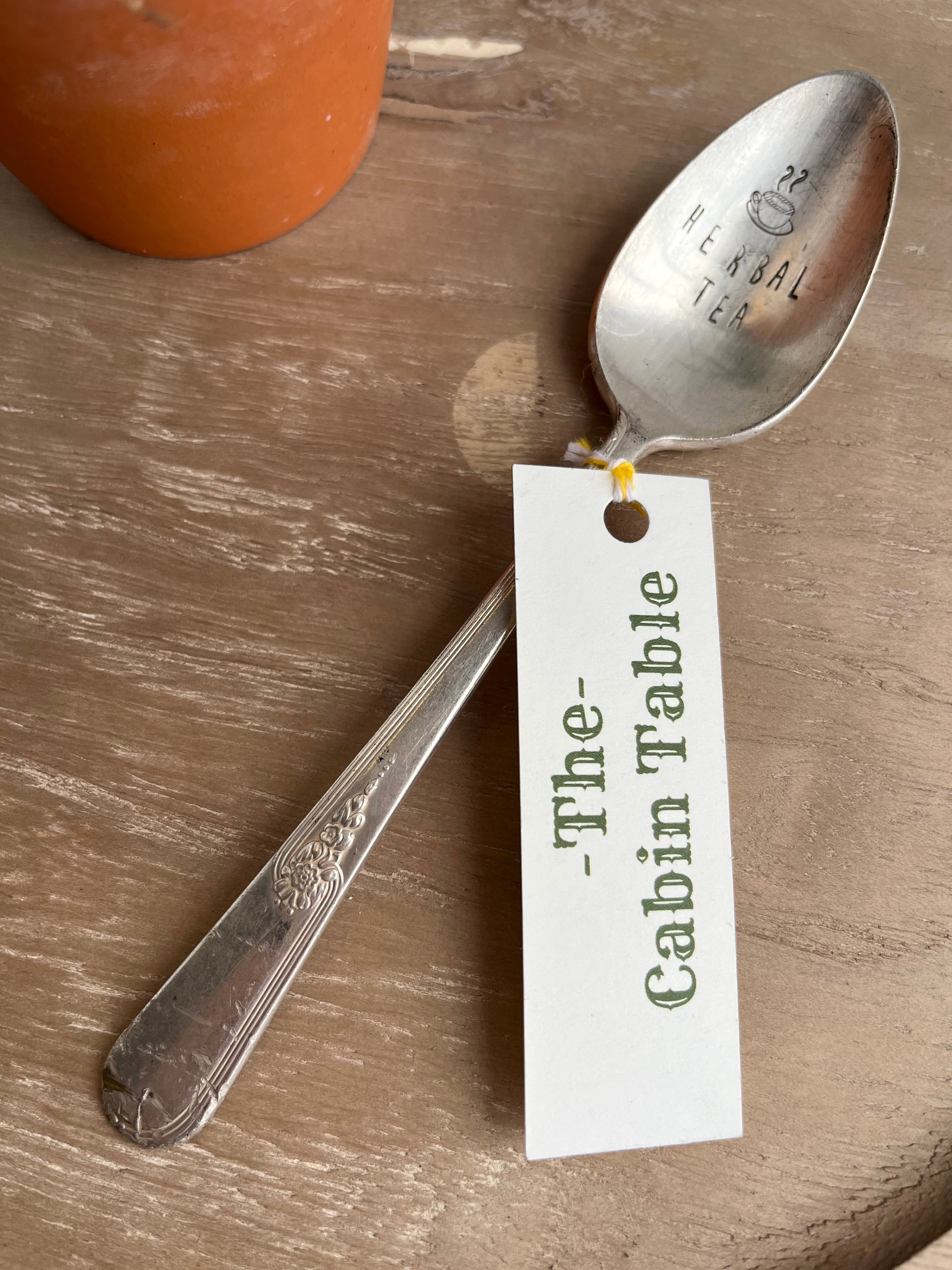 These charming silver plated spoons are stamped with images and words. They are created locally here in Humboldt. You can use these spoons to put your loose leaf tea in your teapot. put jam on your scones or to stir some honey into your cup. They make wonderful gifts.