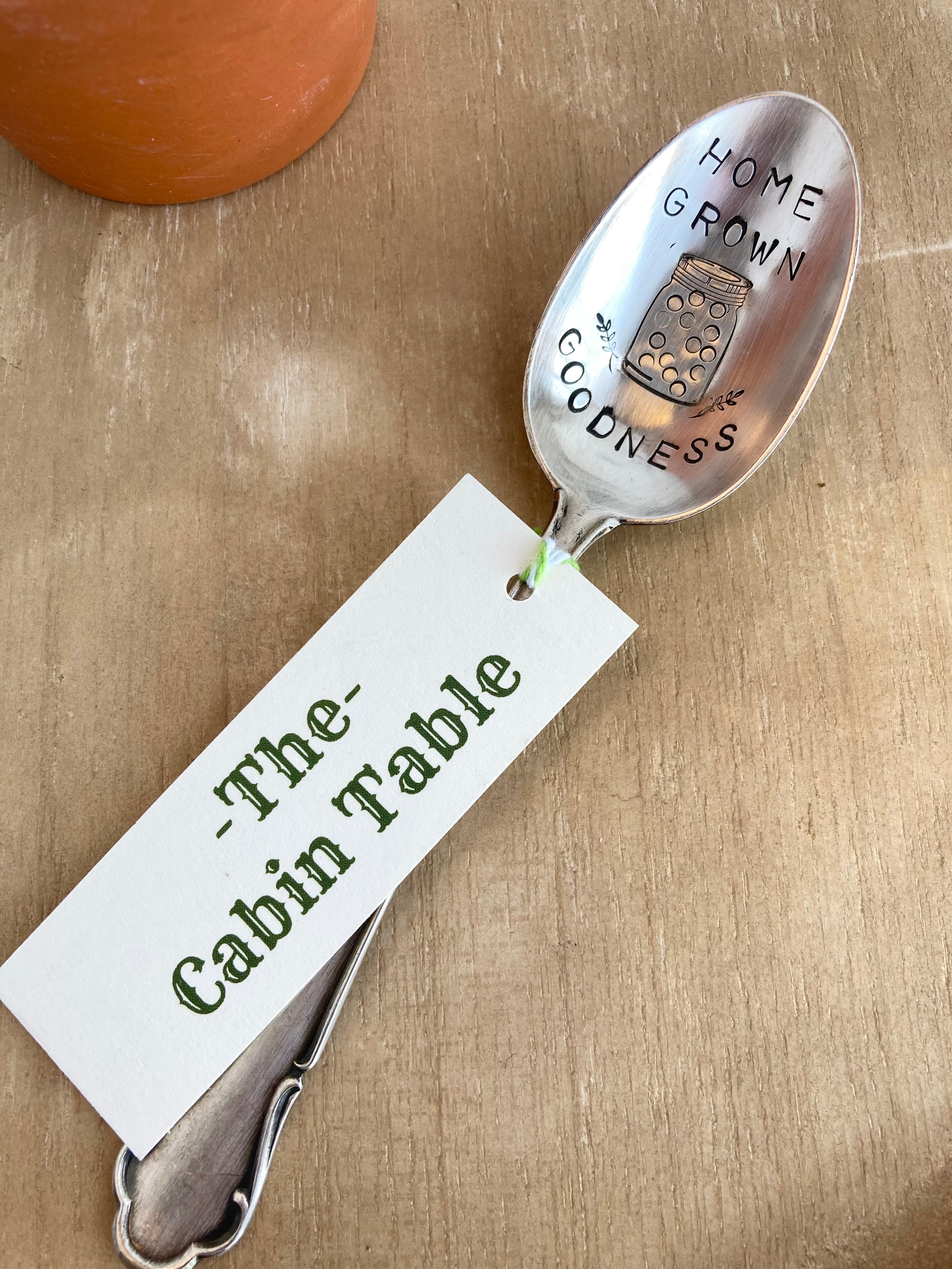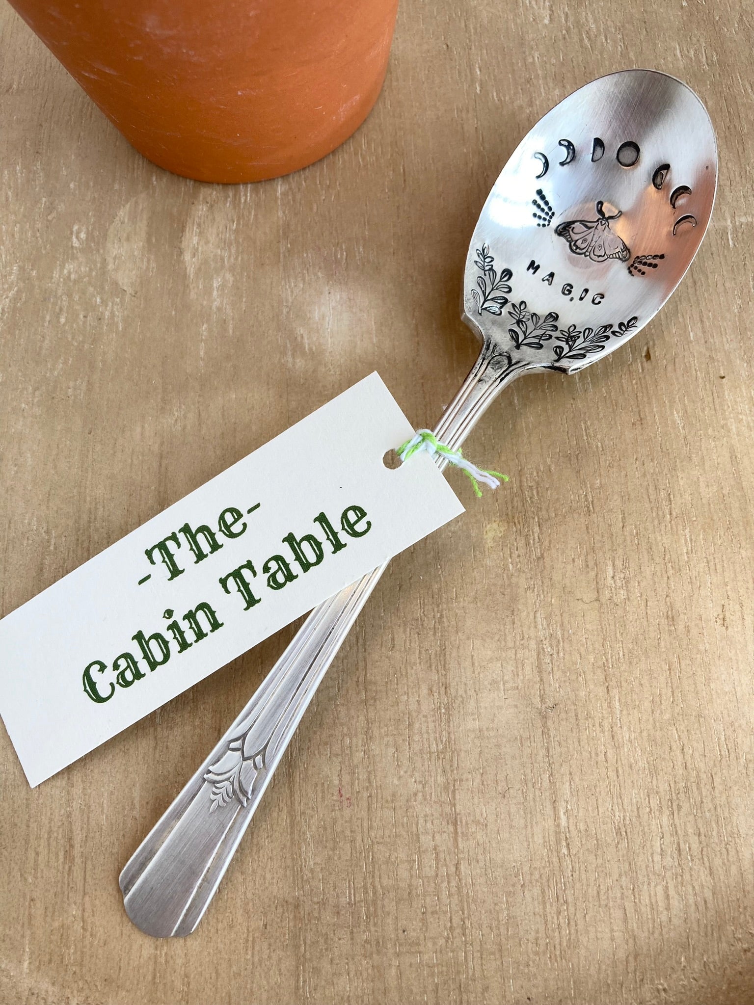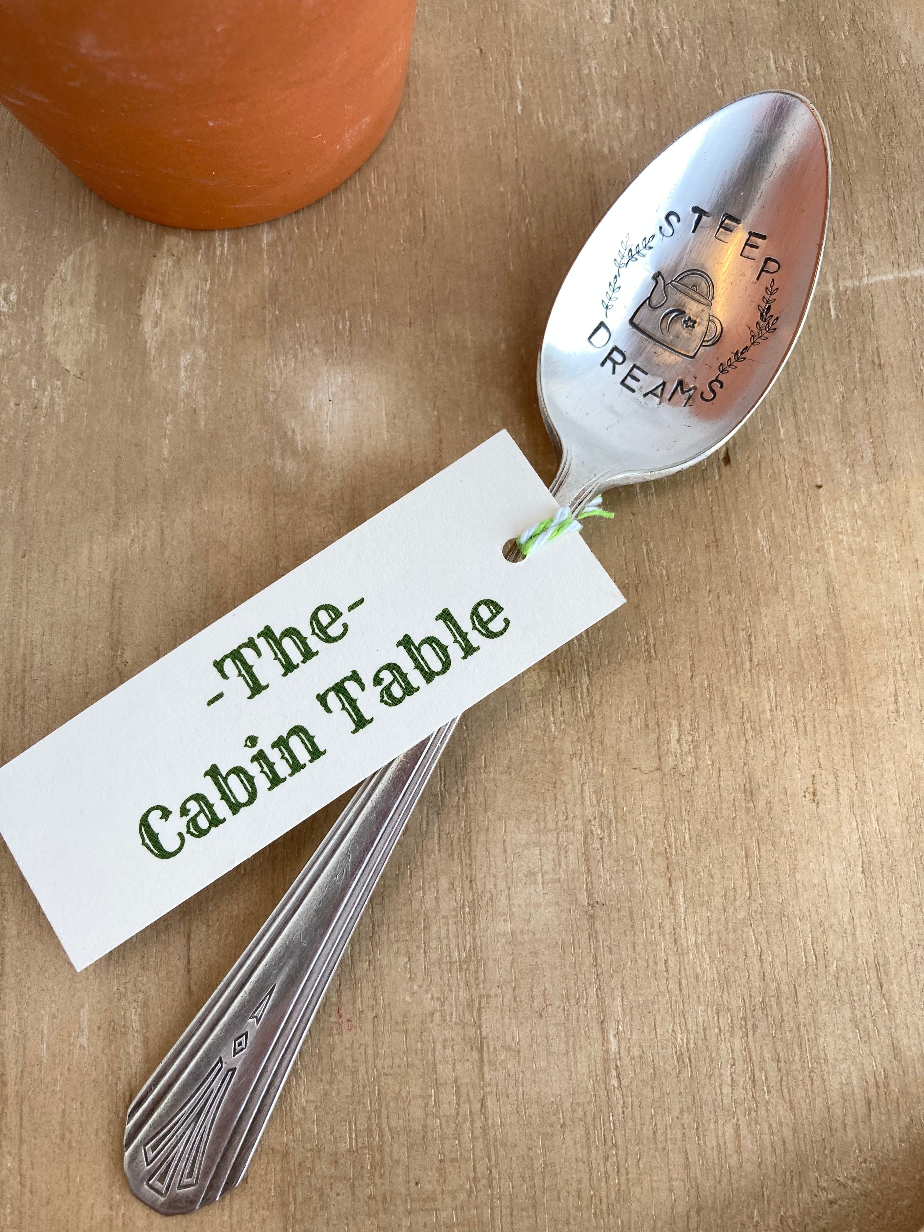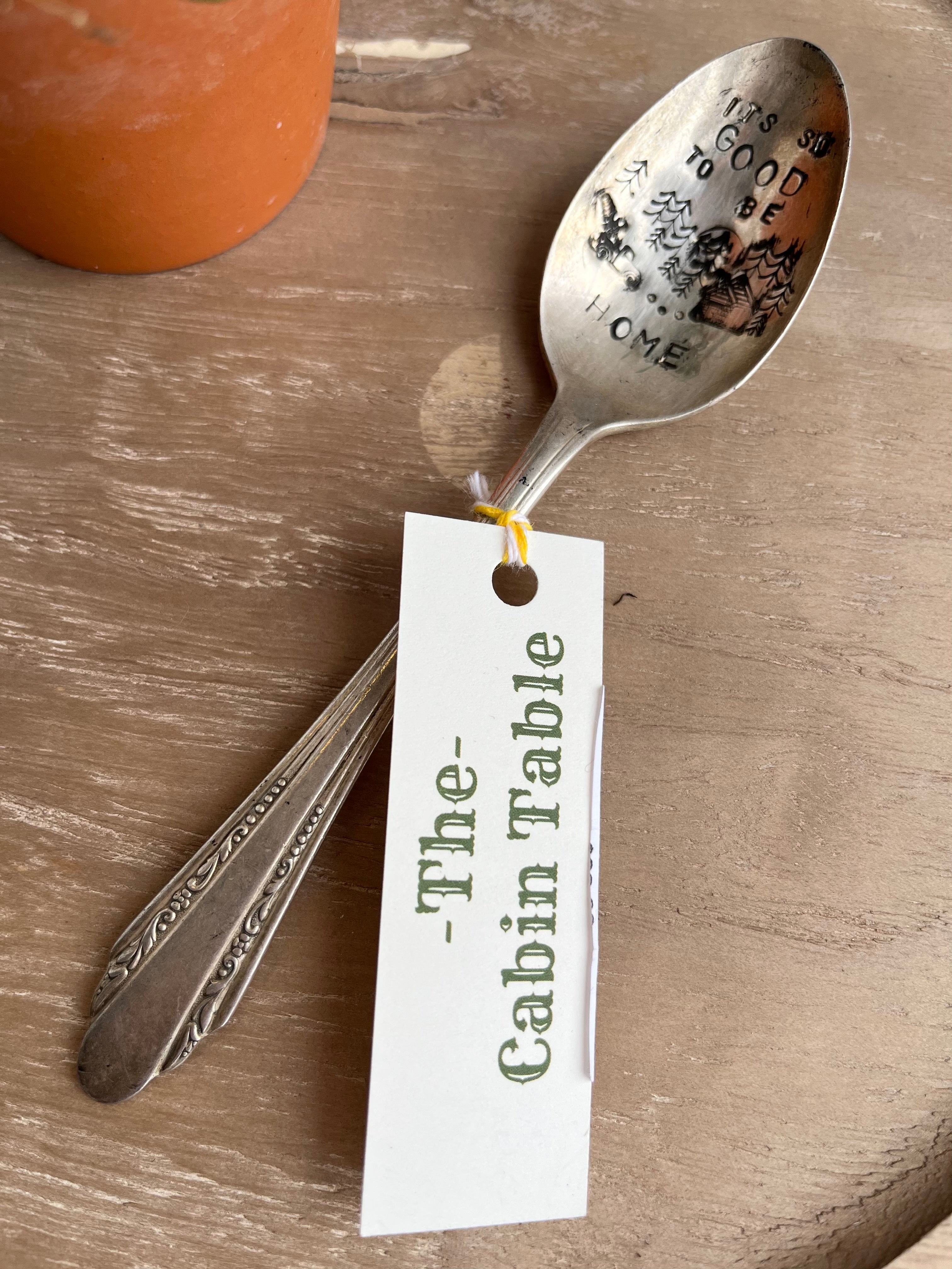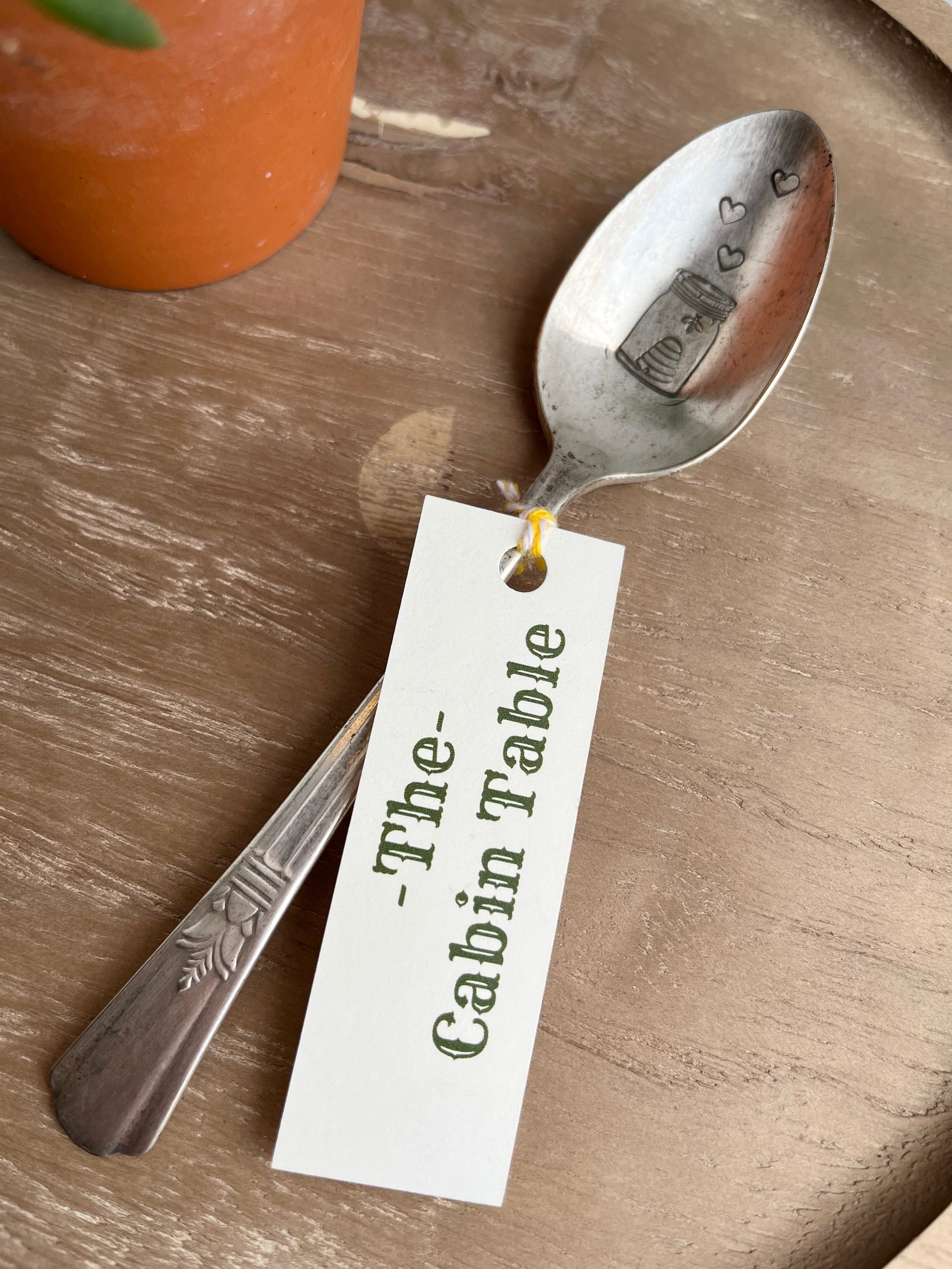 These charming silver plated spoons are stamped with images and words. They are created locally here in Humboldt. You can use these spoons to put your loose leaf tea in your teapot. put jam on your scones or to stir some honey into your cup. They make wonderful gifts.