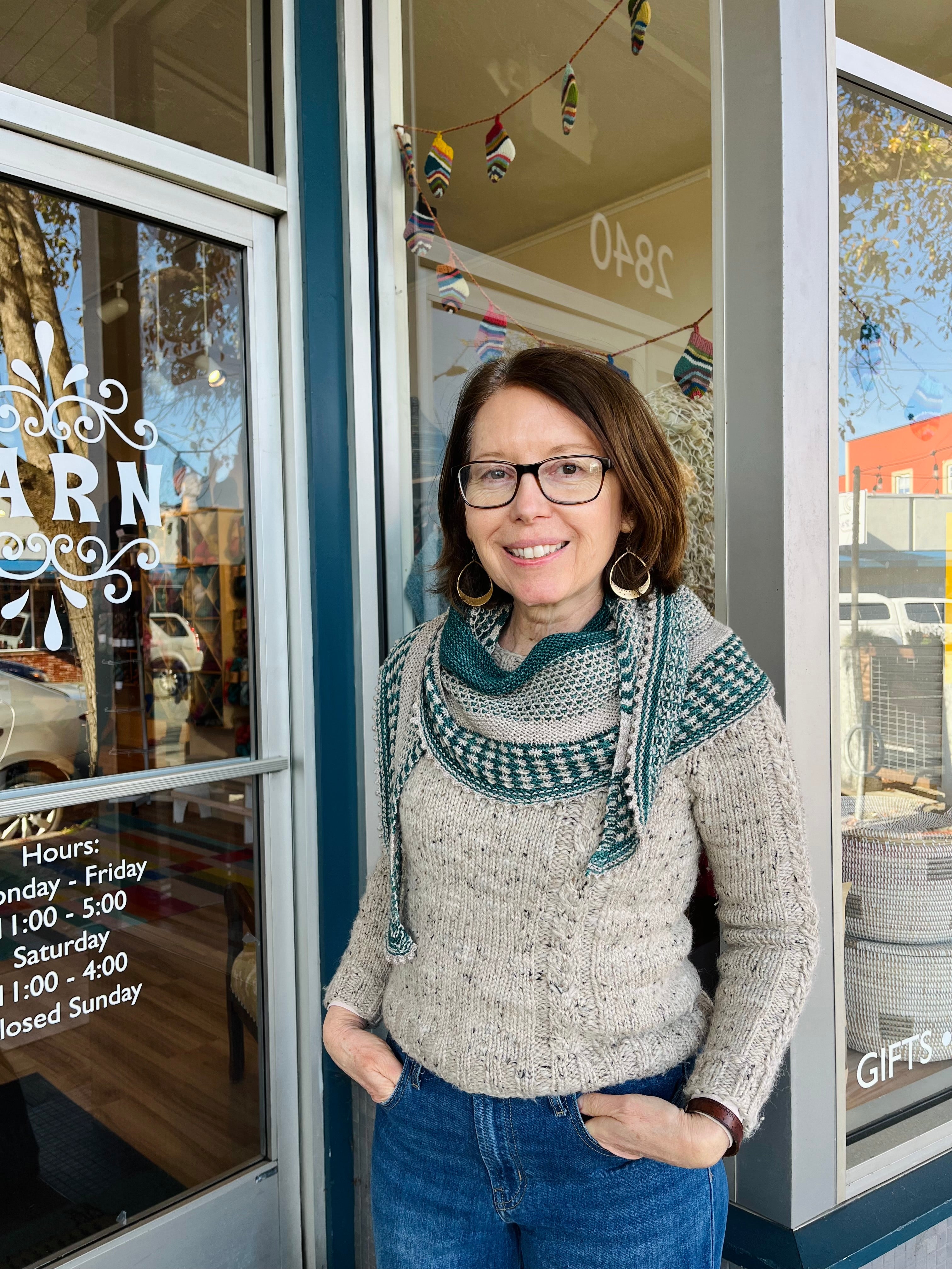 Crescent shaped shawls are fun to wear. I wanted to design a two-color shawl using an offset crescent that plays with texture. Slipped stitch patterns are a great way to do that. The pattern calls for 2 skeins of fingering weight yarn in 2 semi-solid or tonal contrasting colors and size US 5 needles.