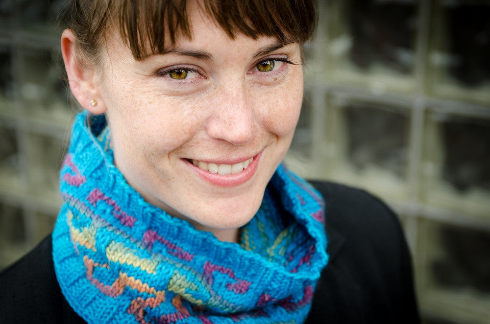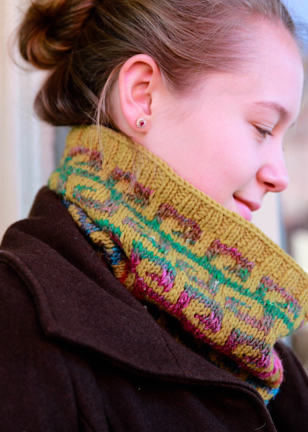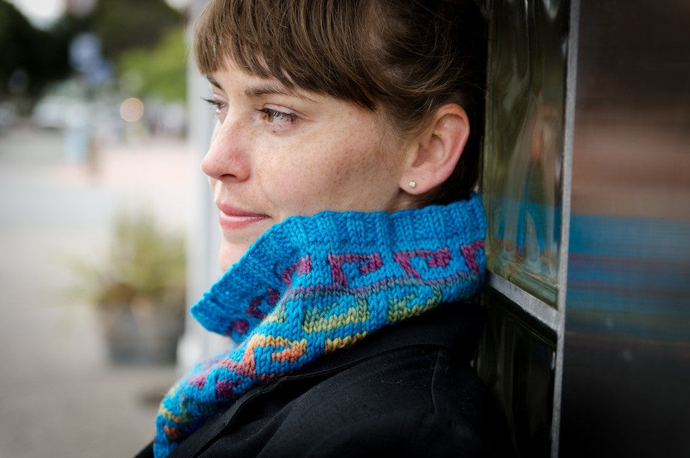 This striking cowl is a quick knit and a great introduction to doing color work using slipped stitches. Because the design is created using slipped stitches, you are only ever knitting with one strand of yarn at a time. No need to worry about stranding. The pattern calls for one skein of a worsted weight yarn in a solid, such as Malabrigo Merino Worsted and one skein of a self-striping yarn such as Reggae Ombré or Silk Garden. You'll need 16-inch circular needles in size US 7 & 8.
