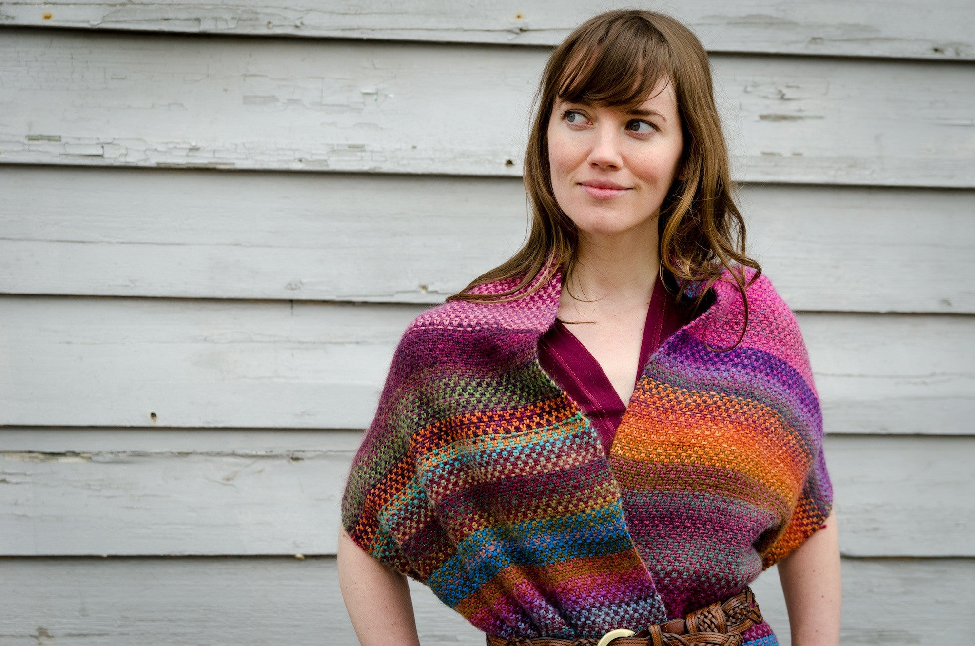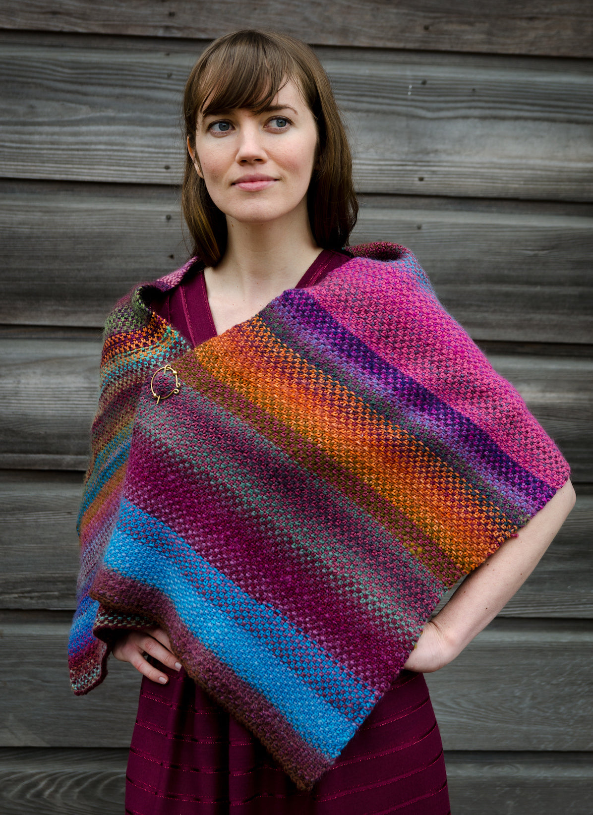 This wrap is a great way to use up all the leftover bits of your stash or random single skeins of yarn that you don’t know what to do with. As you knit you’ll remember all of the projects that you’ve made with those yarns. The wrap can be worn lots of different ways, as a shawl, belted or even sewn together to make a poncho.